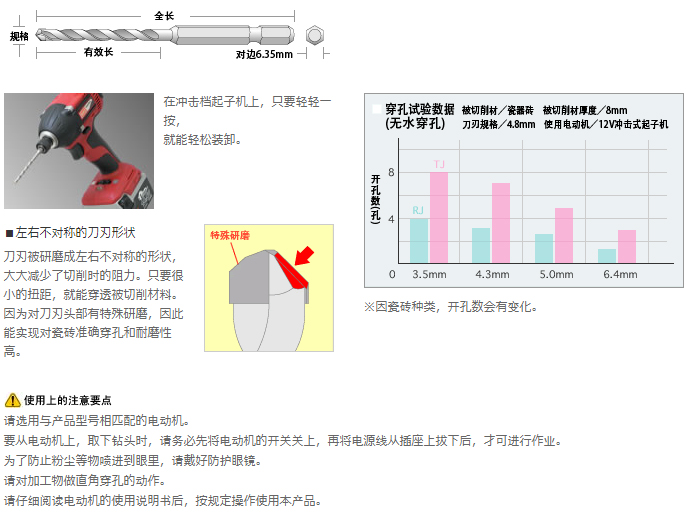 ■可應(yīng)用于沖擊式起子機(jī),針對瓷磚可準(zhǔn)確穿孔,并提高耐磨性。