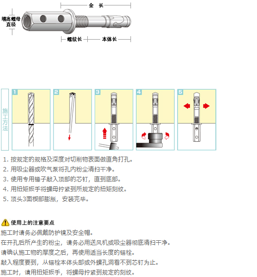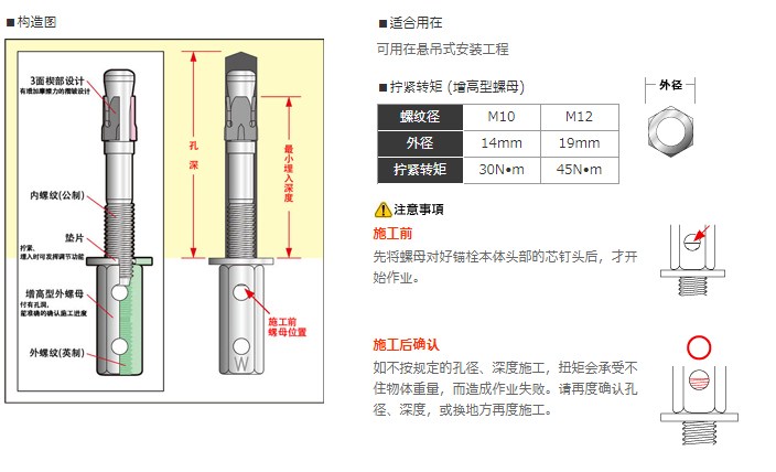 ■利用扭矩原理的施工,以及3面楔部設(shè)計使得該產(chǎn)品在對于懸吊物能發(fā)揮極高強度的固定力。