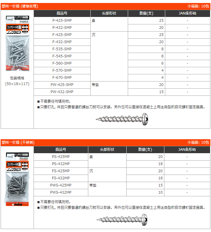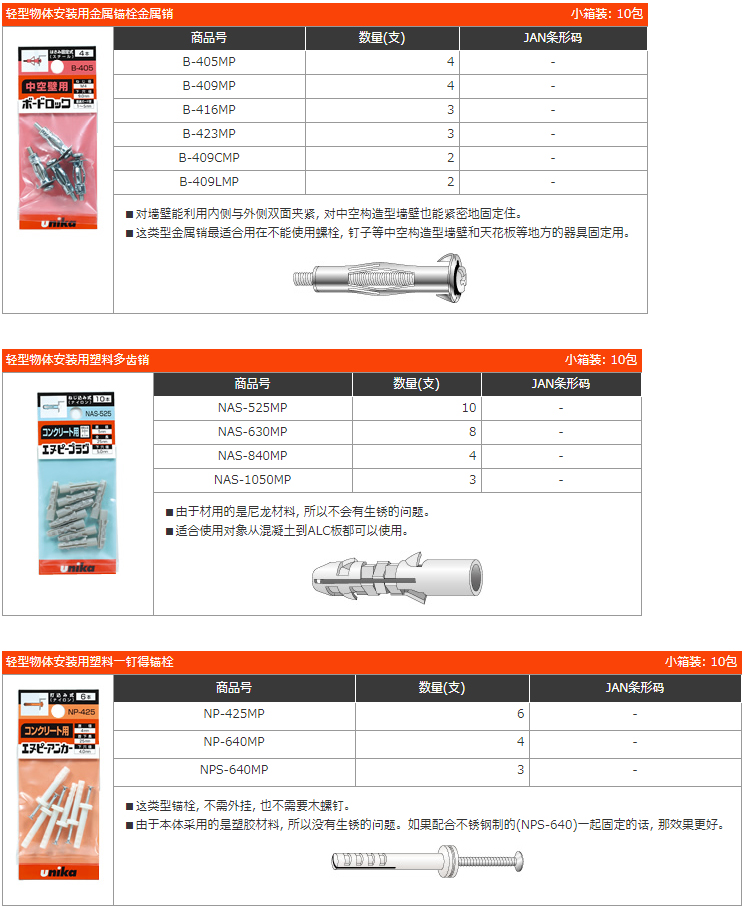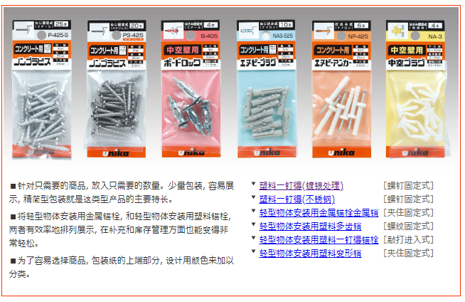■將輕型物體安裝用金屬錨栓, 和輕型物體安裝用塑料錨栓, 兩者有效率地排列展示, 在補充和庫存管理方面也能變得非常輕松。